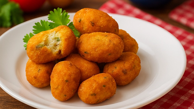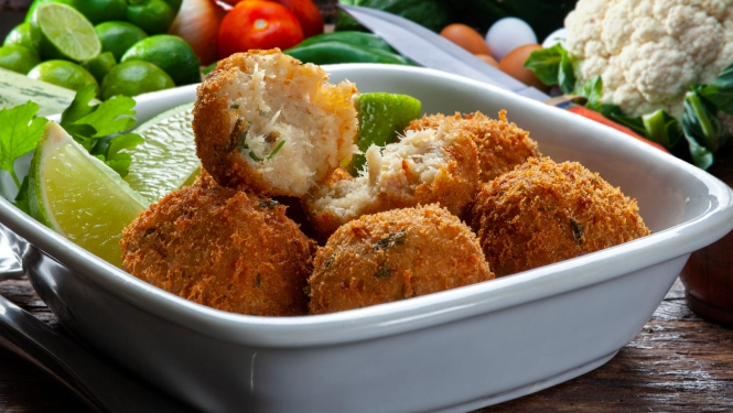 Bolinho artesanal, feito com legítimo bacalhau norueguês. Pronto para assar, fritar e servir com fresco e amor.